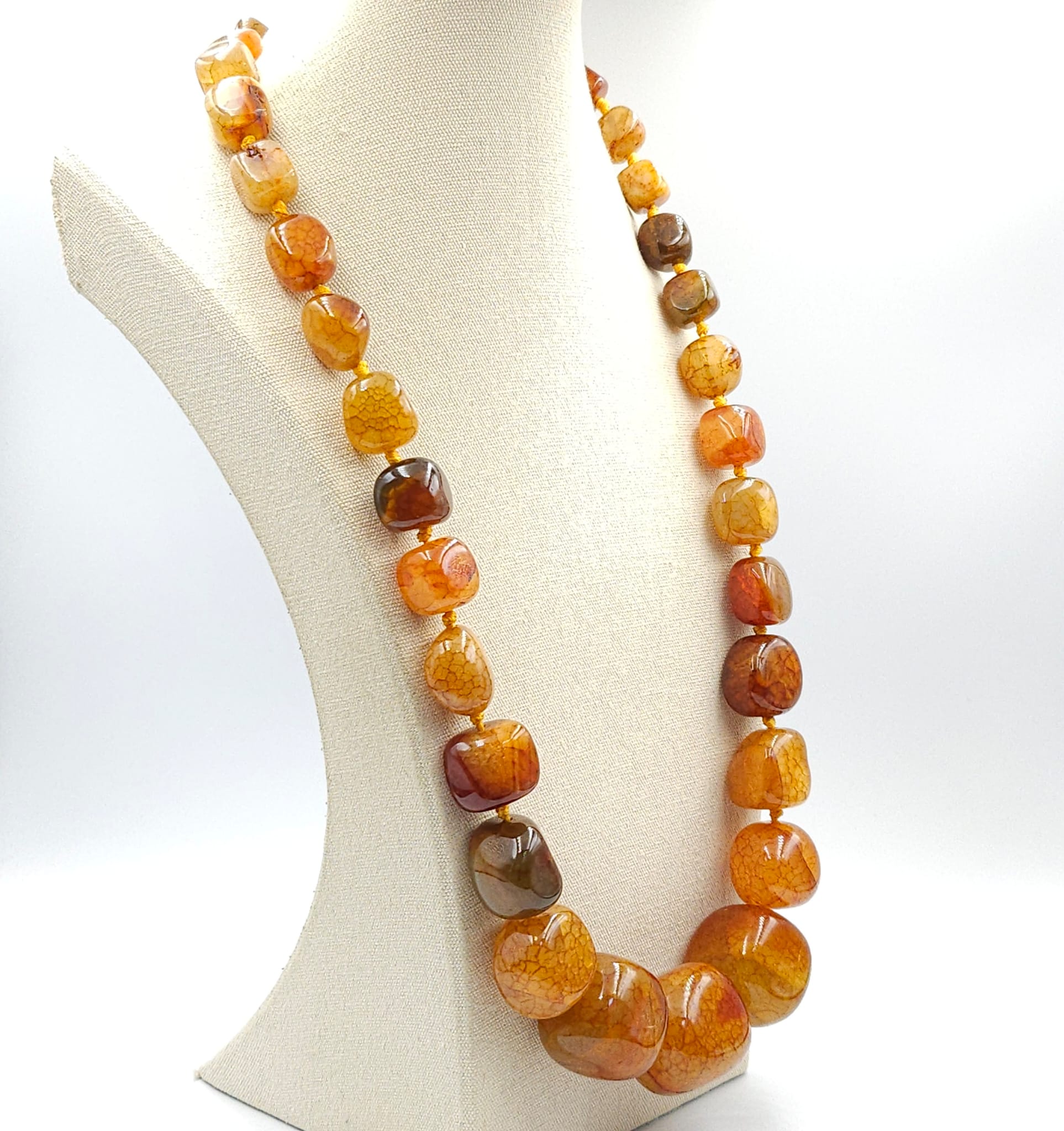 Collana in agata screziata naturale color ambra scura, lunga 72 cm, grandi chicchi separati da nodi.