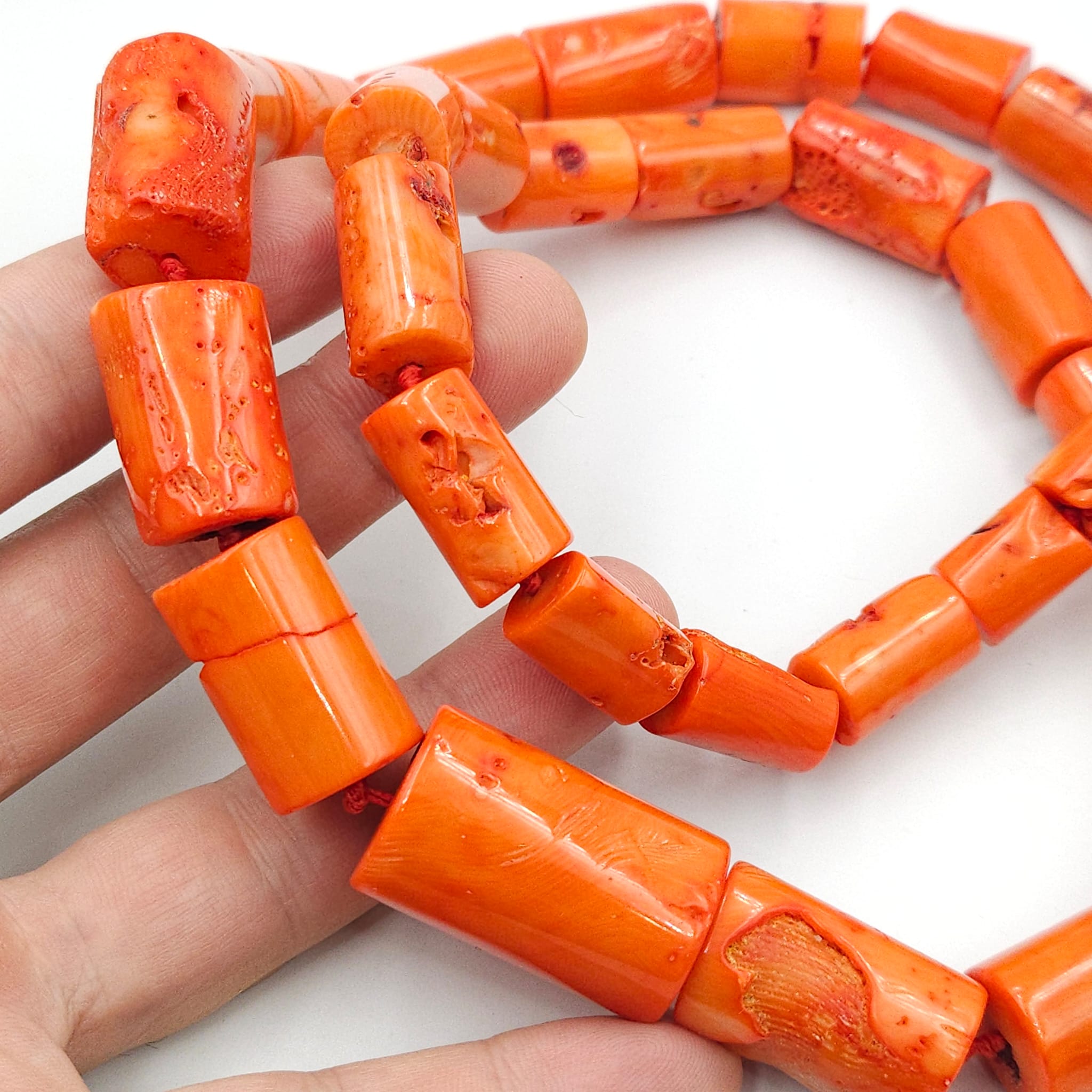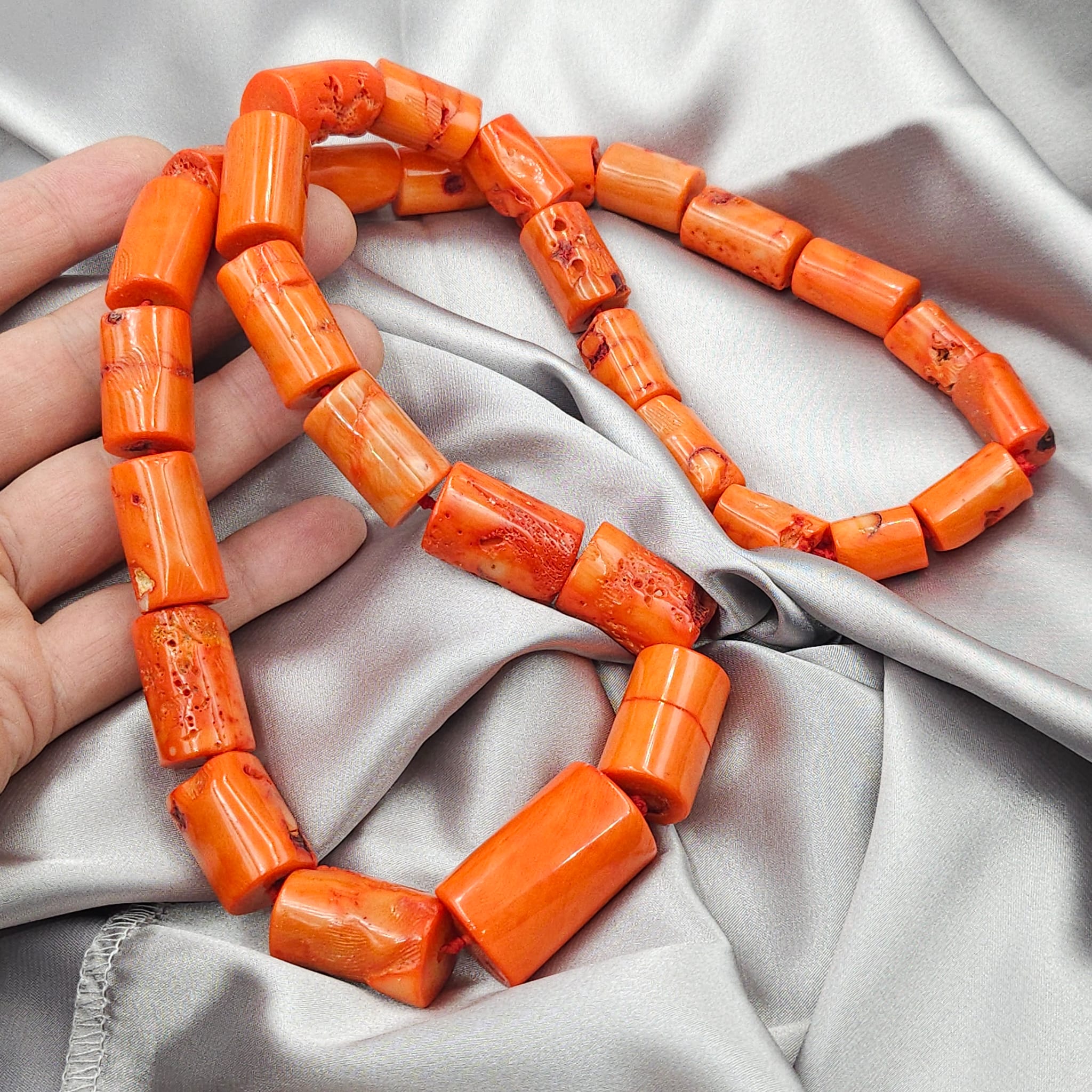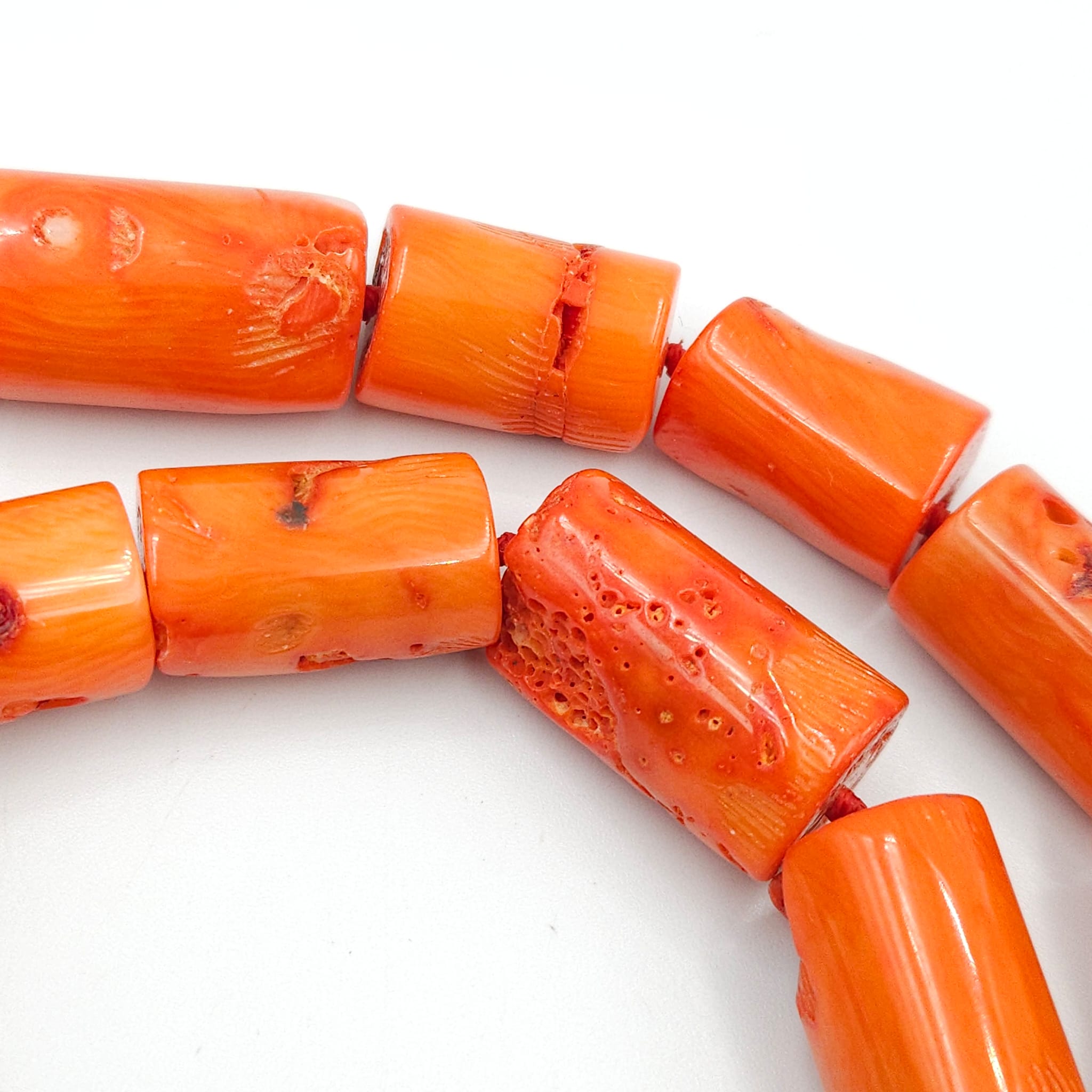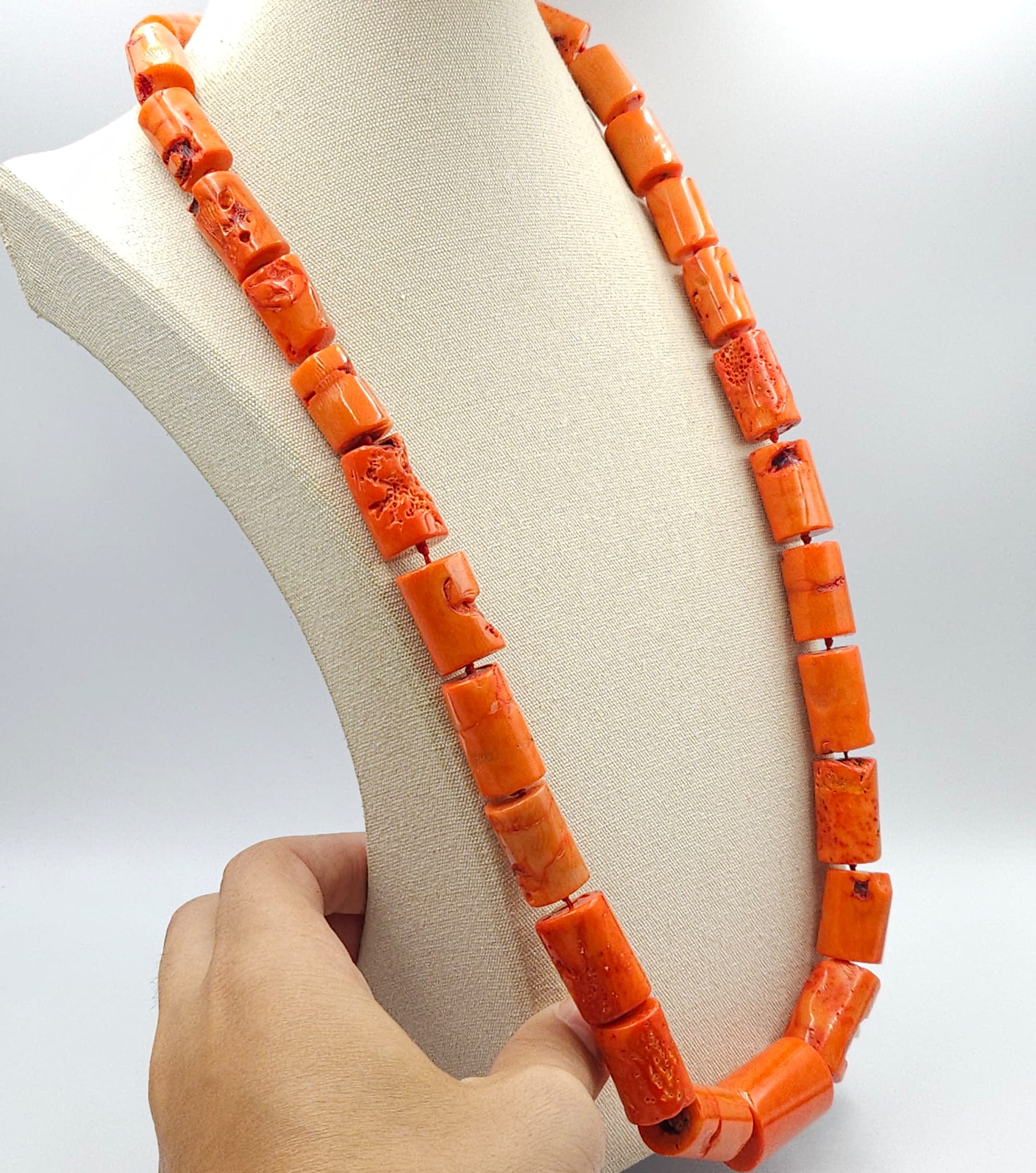 Collana composta da grandi elementi di corallo bambù color salmone, lunga 77 cm e dal peso di 290 grammi.