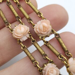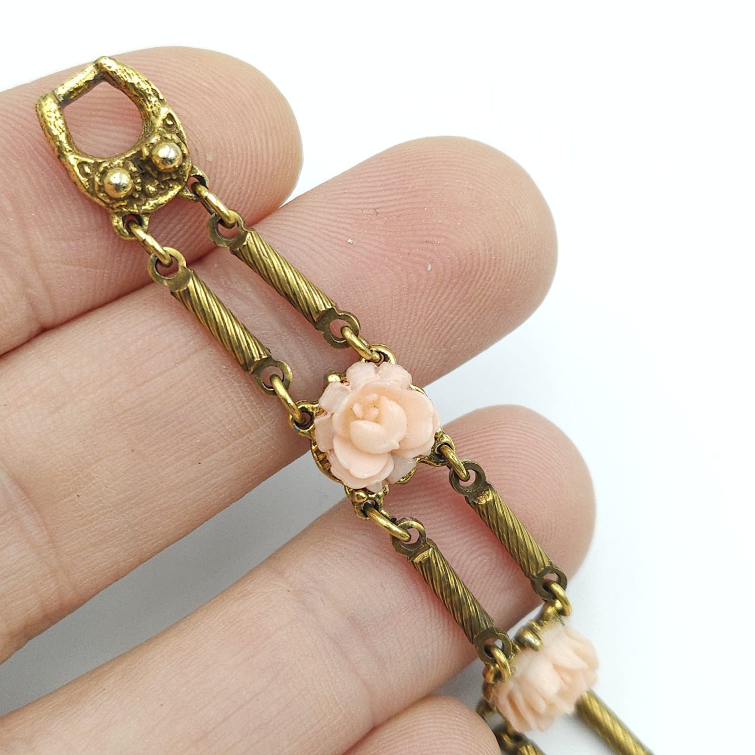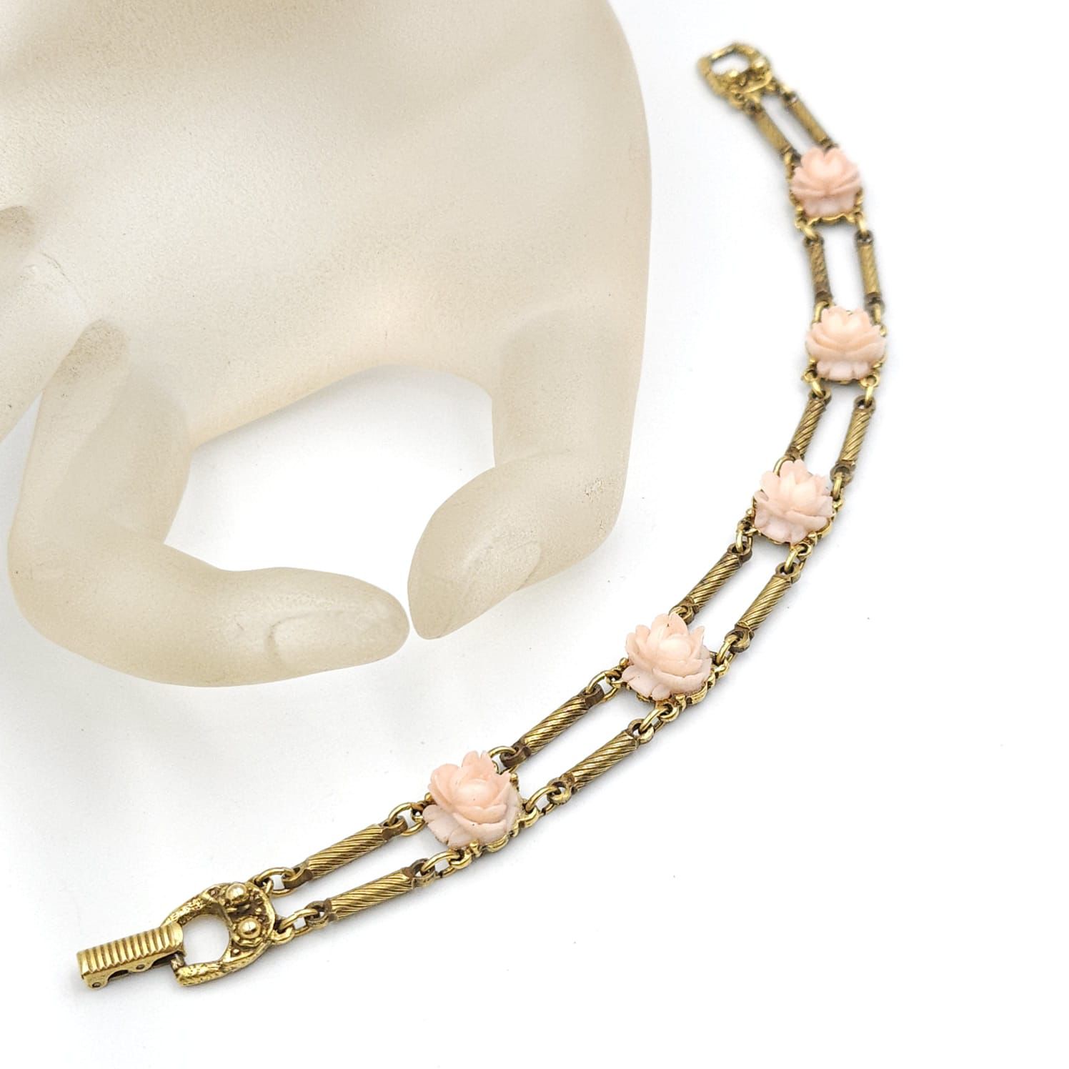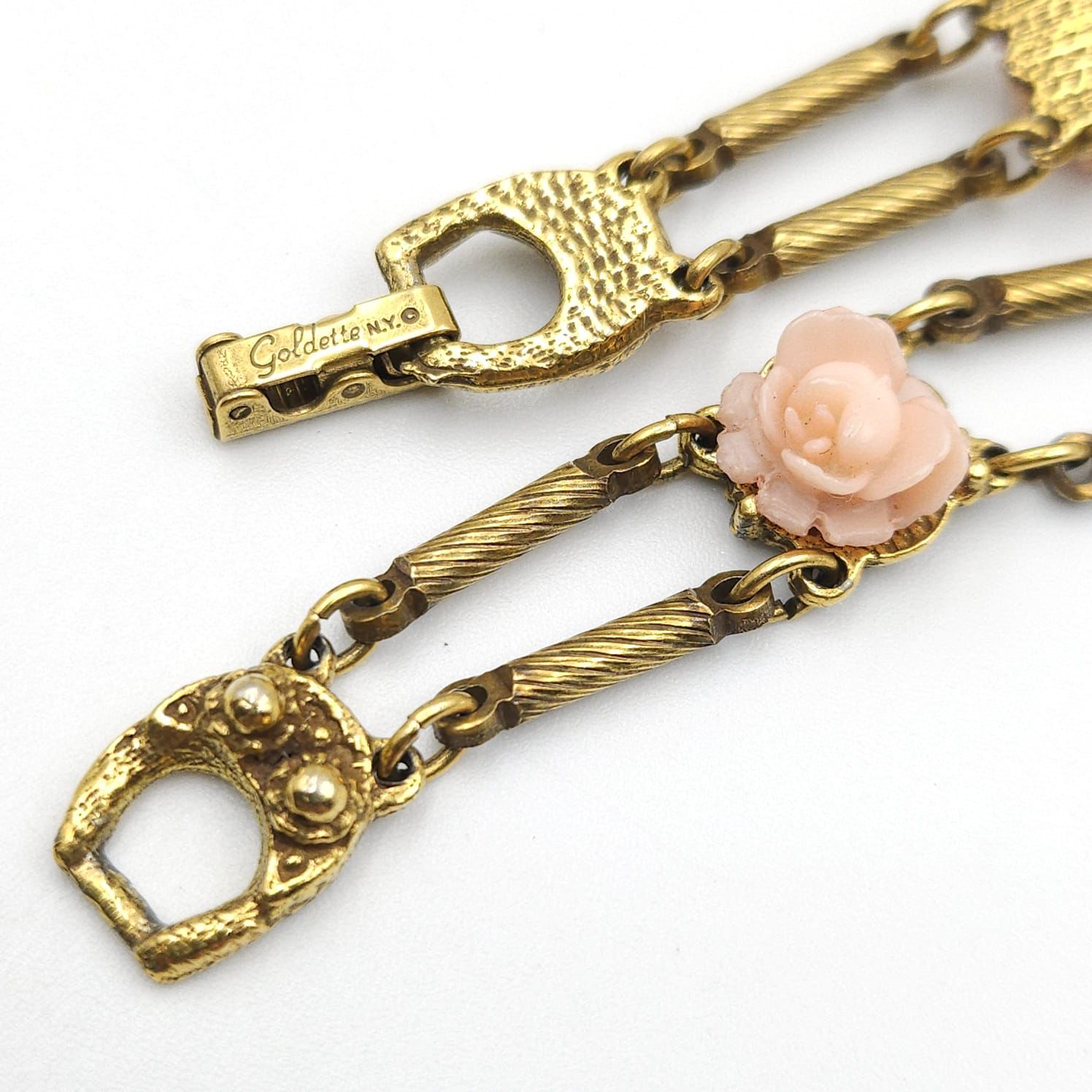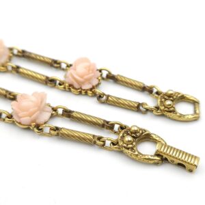 Bracciale anni ‘50 in stile vittoriano firmato Goldette, metallo color oro con rose di lucite rosa, lungo cm 19.