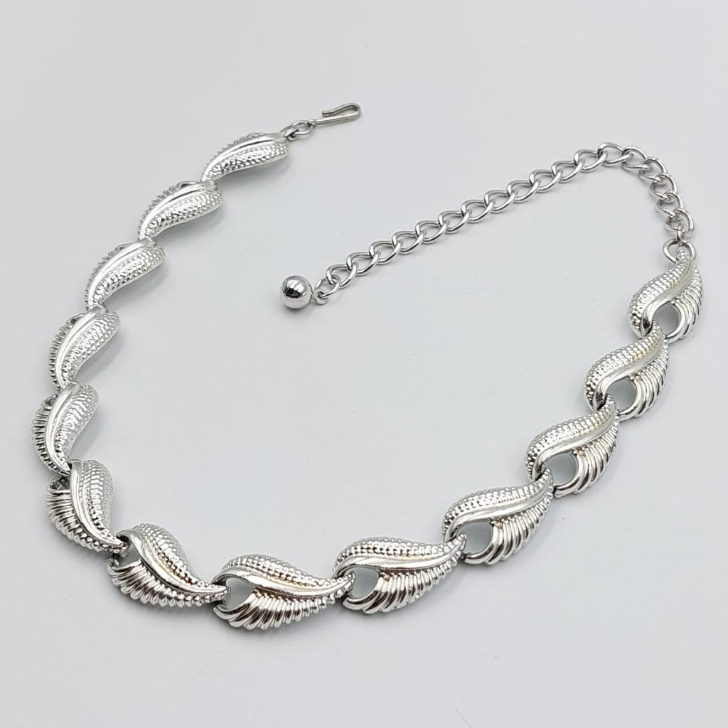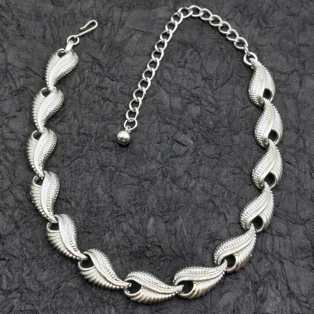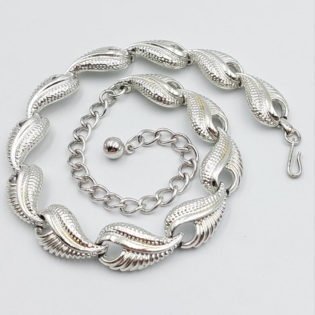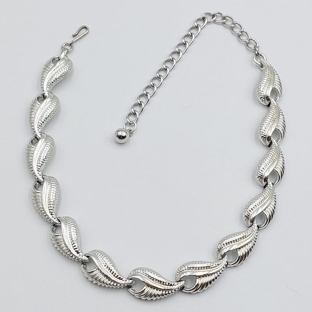 Collana americana anni ‘50 lunga 41 cm, decoro di foglie di metallo color argento.