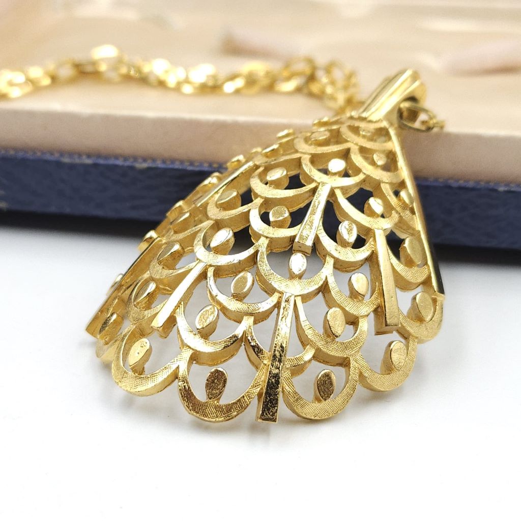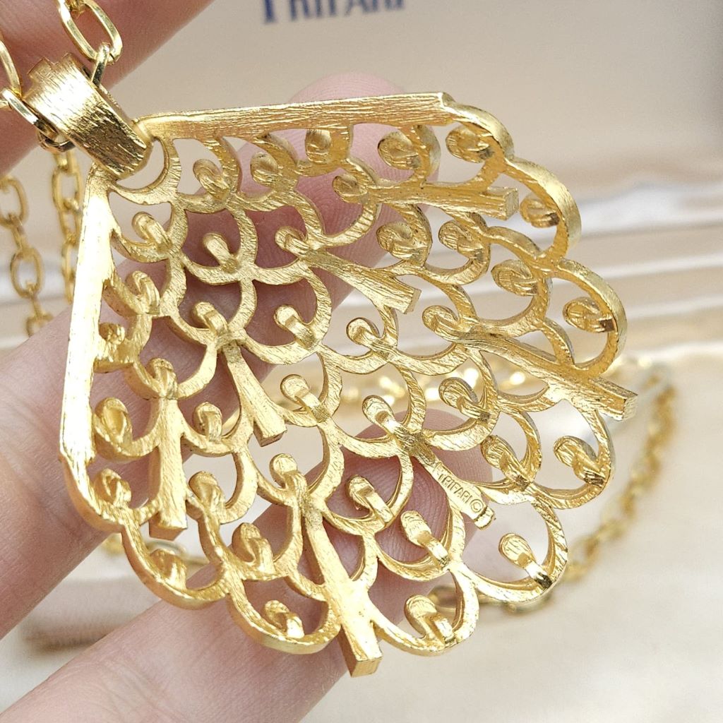 Collana firmata Trifari risalente al 1960 circa, composta da catena di 61 cm e grande pendente dalla forma convessa, realizzata in lega Trifanium color oro satinato con particolari lucidi.
